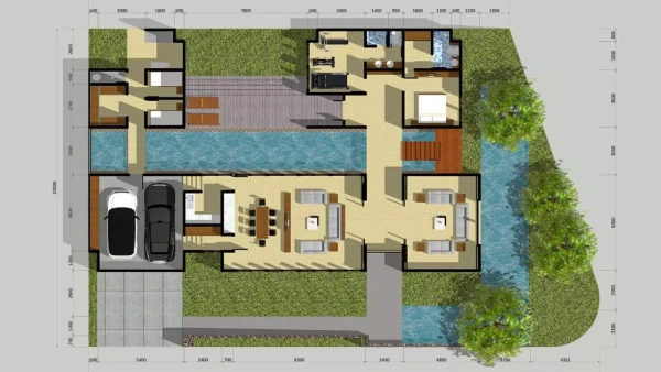 Ciri-ciri: Denah ini dirancang untuk mengintegrasikan ruang dalam (interior) dengan ruang luar (eksterior) secara harmonis. Ada penekanan pada area taman, halaman depan atau belakang, bahkan inner court (halaman di tengah rumah) untuk menciptakan privasi dan area hijau.