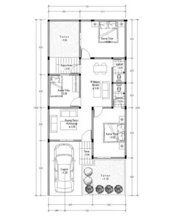 Luas tanah minimal yang disarankan adalah 7×12 meter atau 84 $m^2$. Sisa lahan bisa digunakan untuk carport di depan dan area resapan atau taman kecil di belakang.